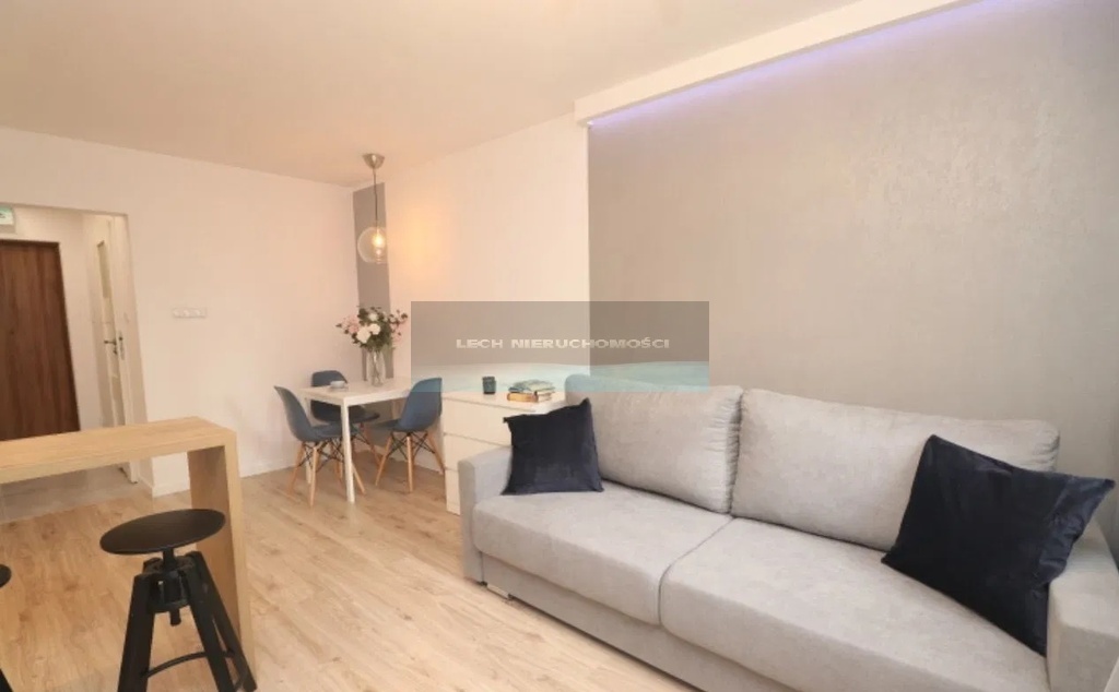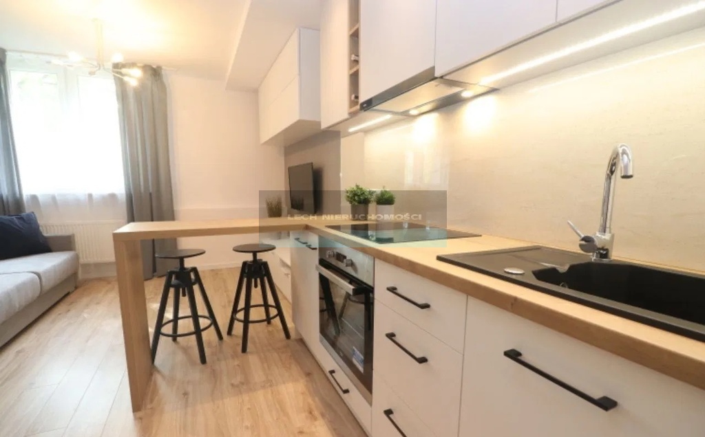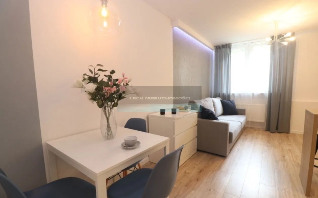 Pokój - przestronny i funkcjonalny z aneksem kuchennym wyposażonym w piekarnik, płytę indukcyjną, lodówkę. Kanapa z funkcją spania z Agata Meble. Zabudowa RTV, telewizor, stół, krzesła, stolik kawowy, firany, zasłony, stołki, stołki hokery