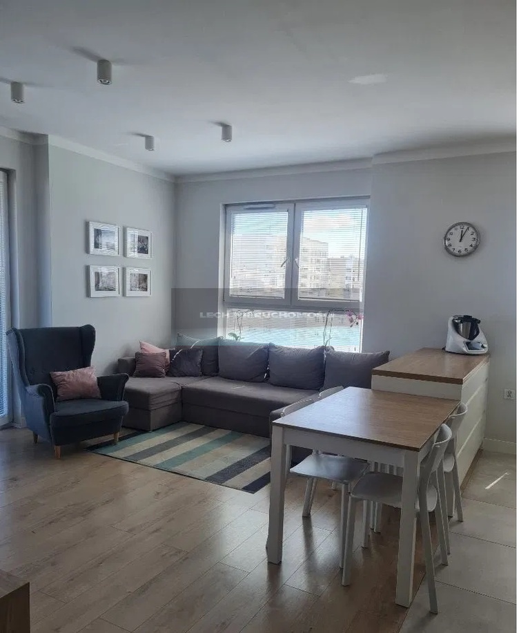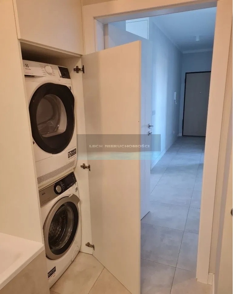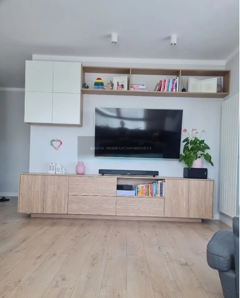 Mieszkanie wyposażone jest w meble na wymiar wykonane przez stolarza z płyty lakierowanej mdf. W mieszkaniu znajduje się dużo miejsca do przechowywania.