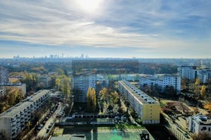 Widok z okien na panoramę centrum Warszawy i tereny zielone Bielan