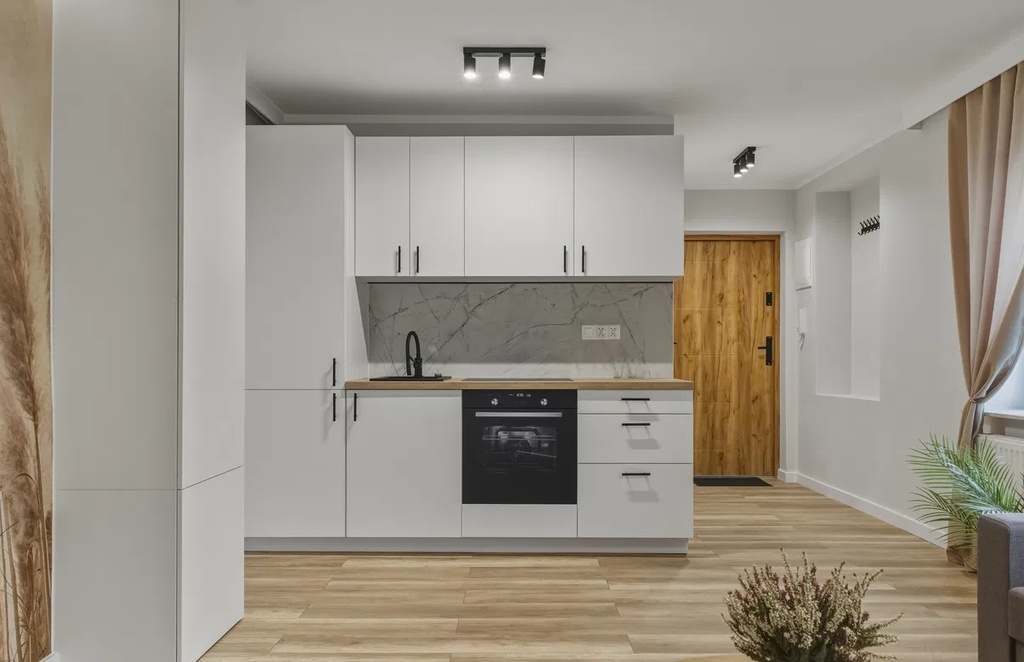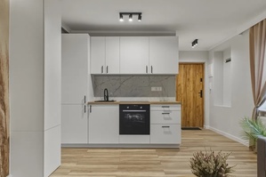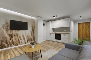 - Przestronny salon z aneksem kuchennym i ścianą telewizyjną (20,5m2),