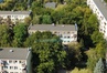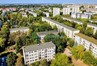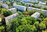 Osiedle jest zielone, duże przestrzenie między blokami.