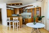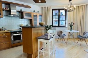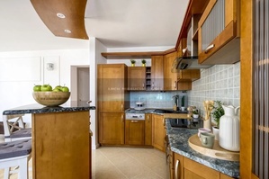 Kuchnia zabudowana na wymiar, parapety oraz blaty w mieszkaniu z marmuru.