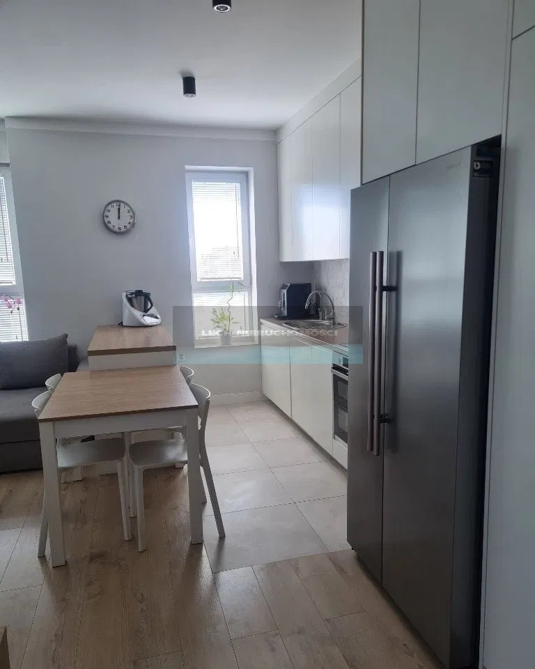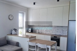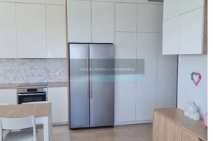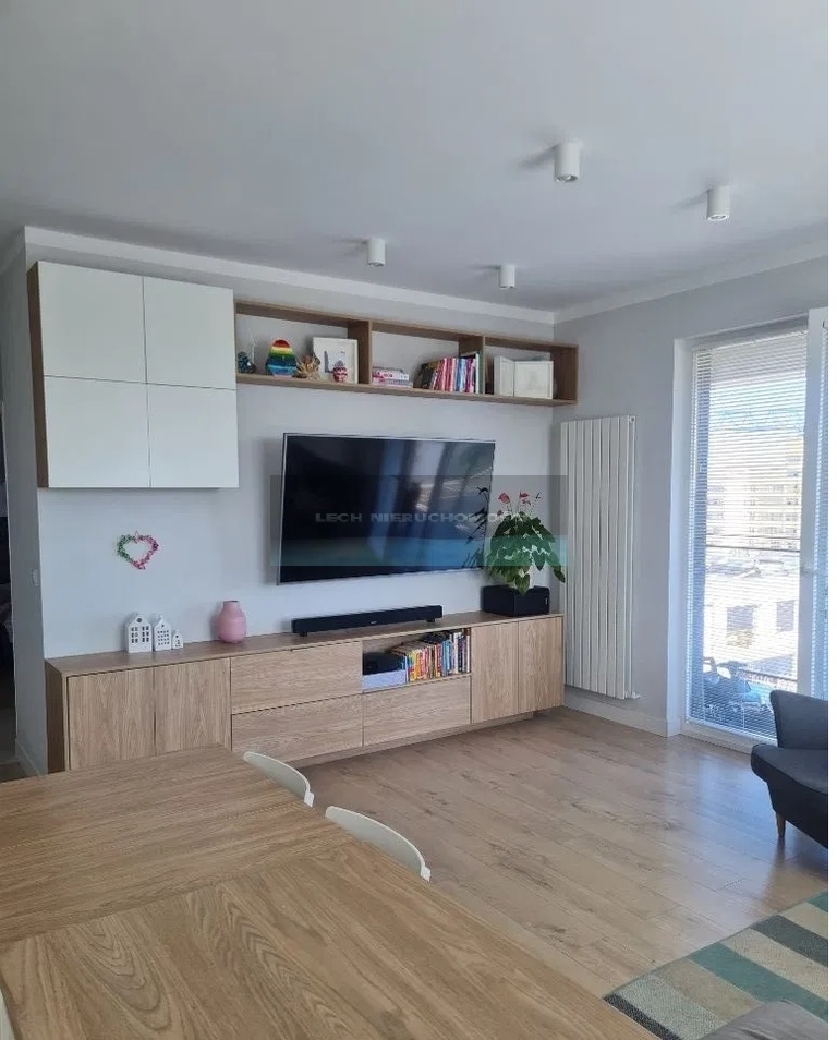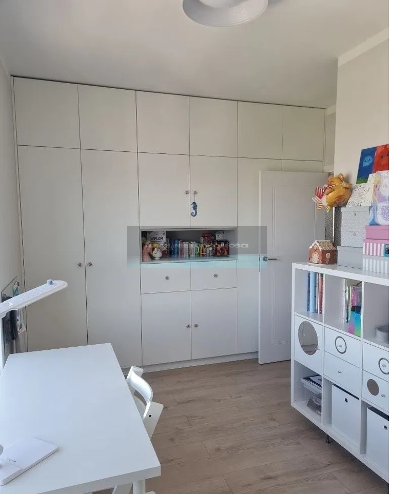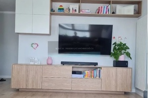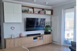Mieszkanie wyposażone jest w meble na wymiar wykonane przez stolarza z płyty lakierowanej mdf. W mieszkaniu znajduje się dużo miejsca do przechowywania.
