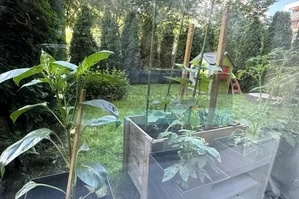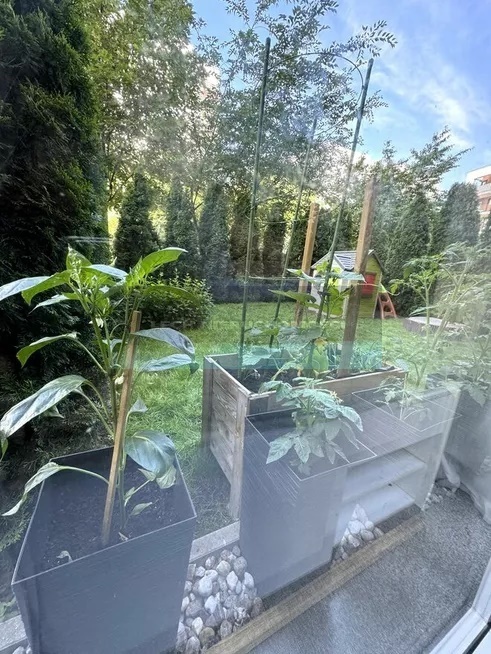 Ogródek ogrodzony i obsadzony 19 tujami Szmaragd (aktualnie mają 2-3m także teren w pełni zasłonięty) dodatkowo zamontowana jest siatka z wysięgnikami, aby kot nie przeskoczył.