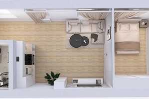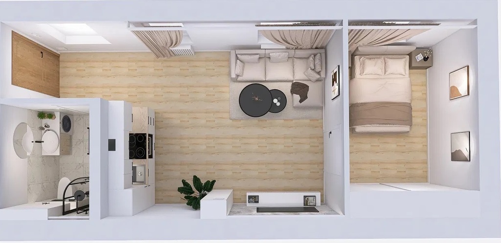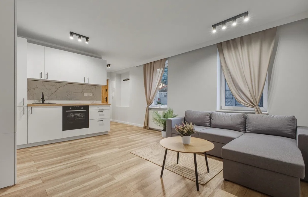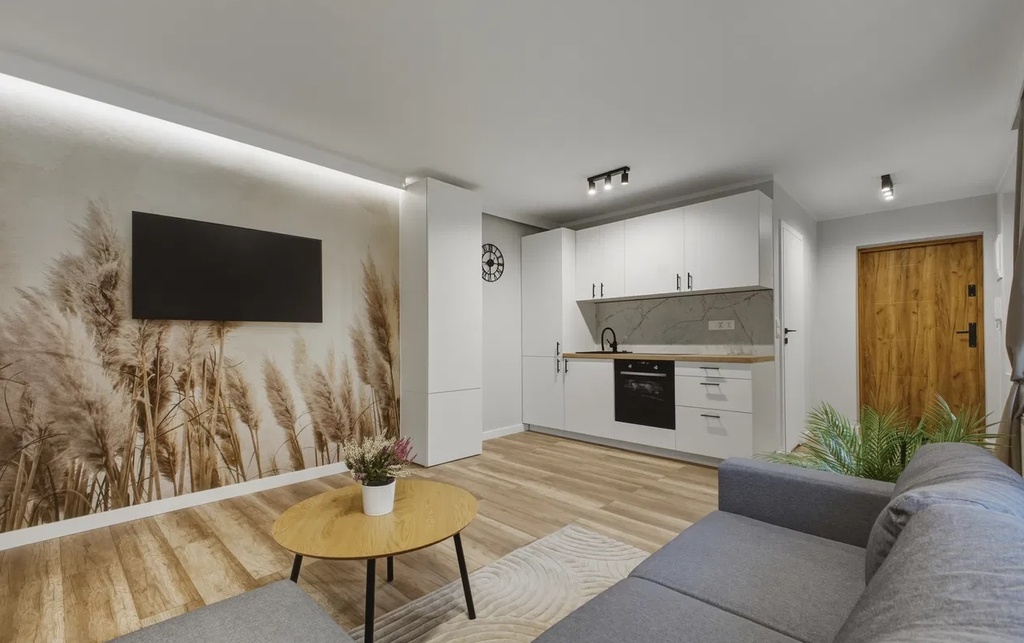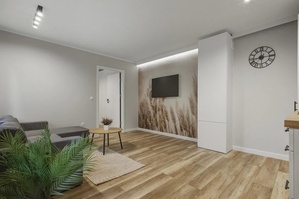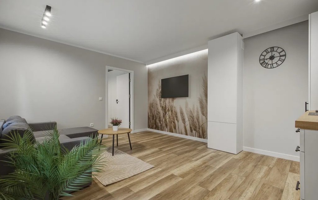 - Przestronny salon z aneksem kuchennym i ścianą telewizyjną (20,5m2),