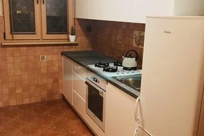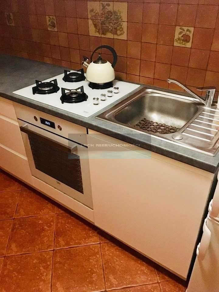- Kuchnia (ok. 6 m2), pełna zabudowa kuchenna, lodówka, płyta gazowa, piekarnik, pralka.