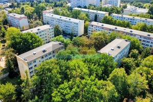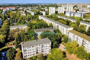 Osiedle jest zielone, duże przestrzenie między blokami.