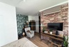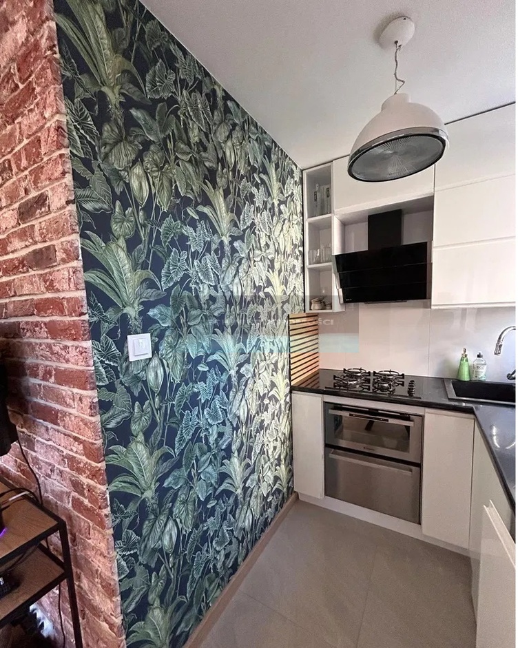 Na ścianach gładzie, tapeta, cegła klinkierowa firmy Nelissen, na podłodze panele.